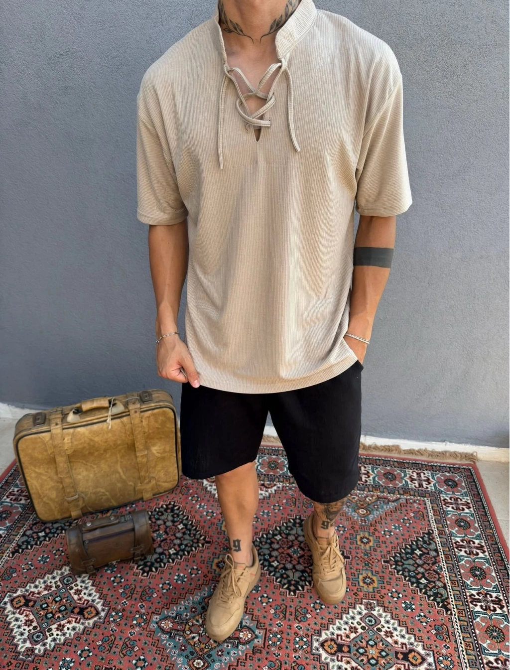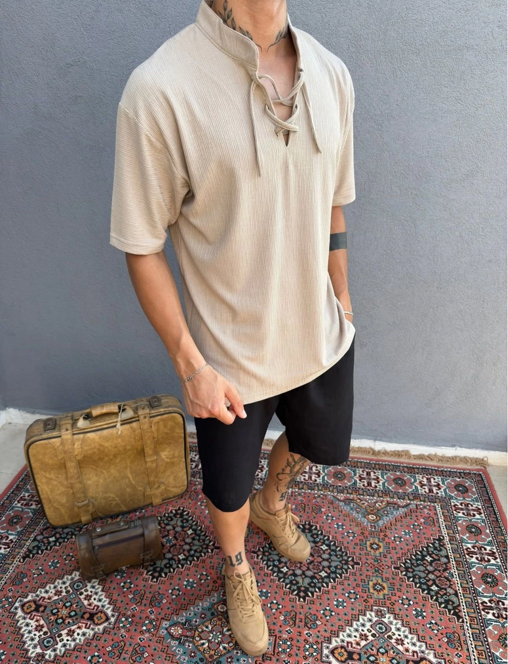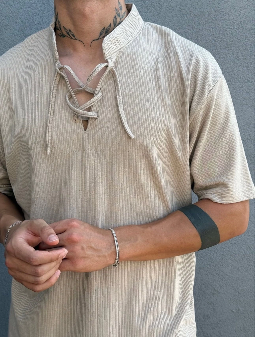 Bej İp Yaka Detay Jakar Kumaş T-Shirt