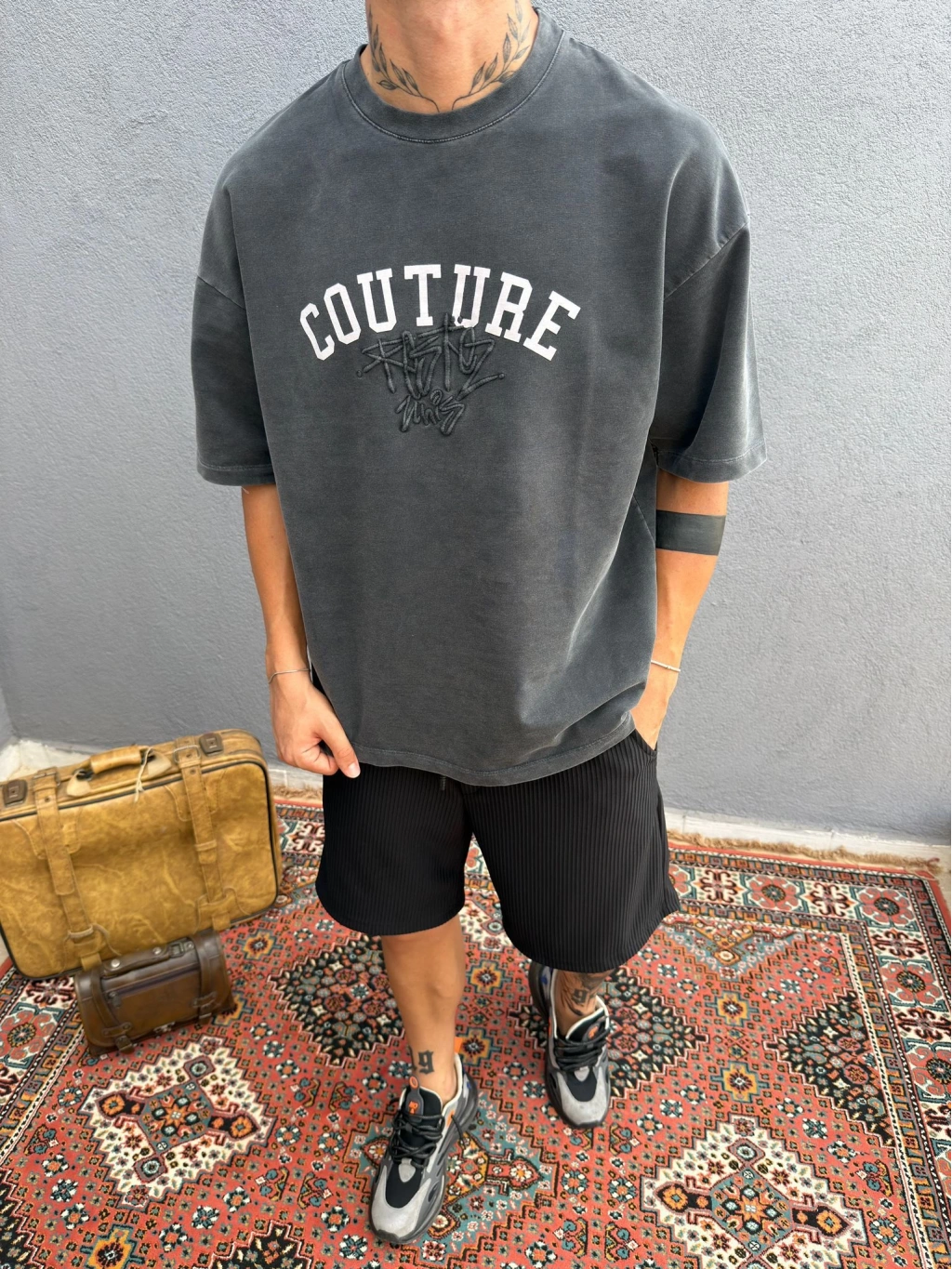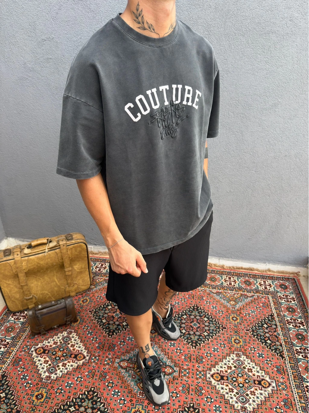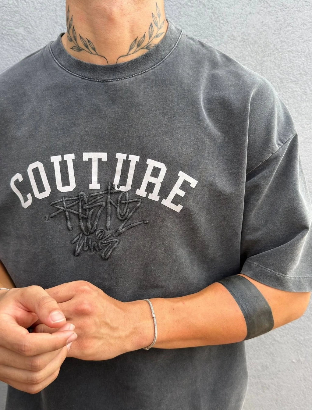 Koyu Gri Asit Yıkamalı Nakış Detaylı Oversize T-Shirt