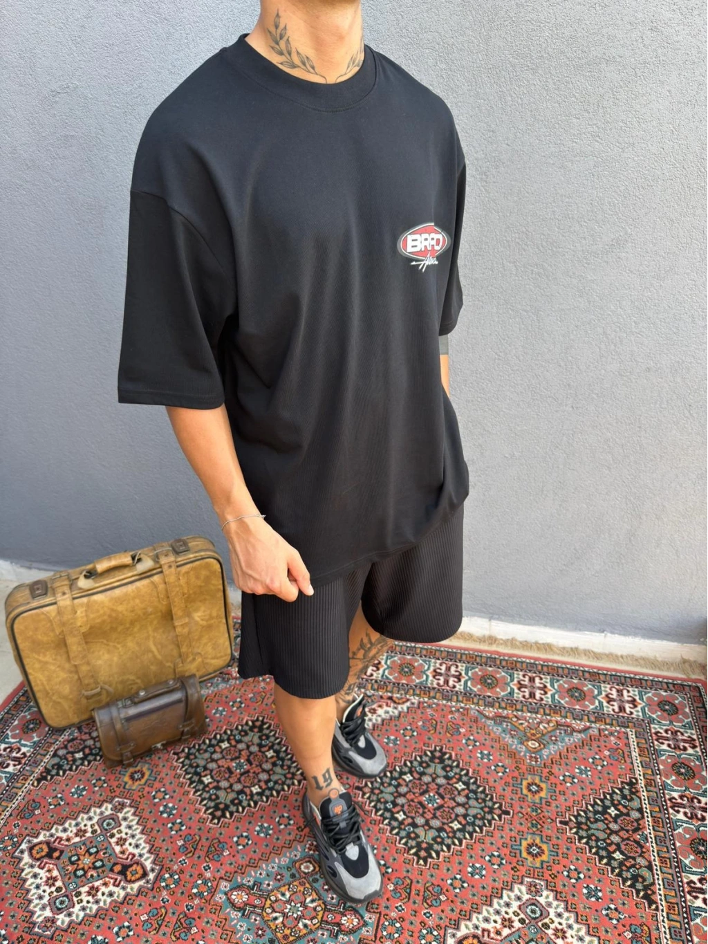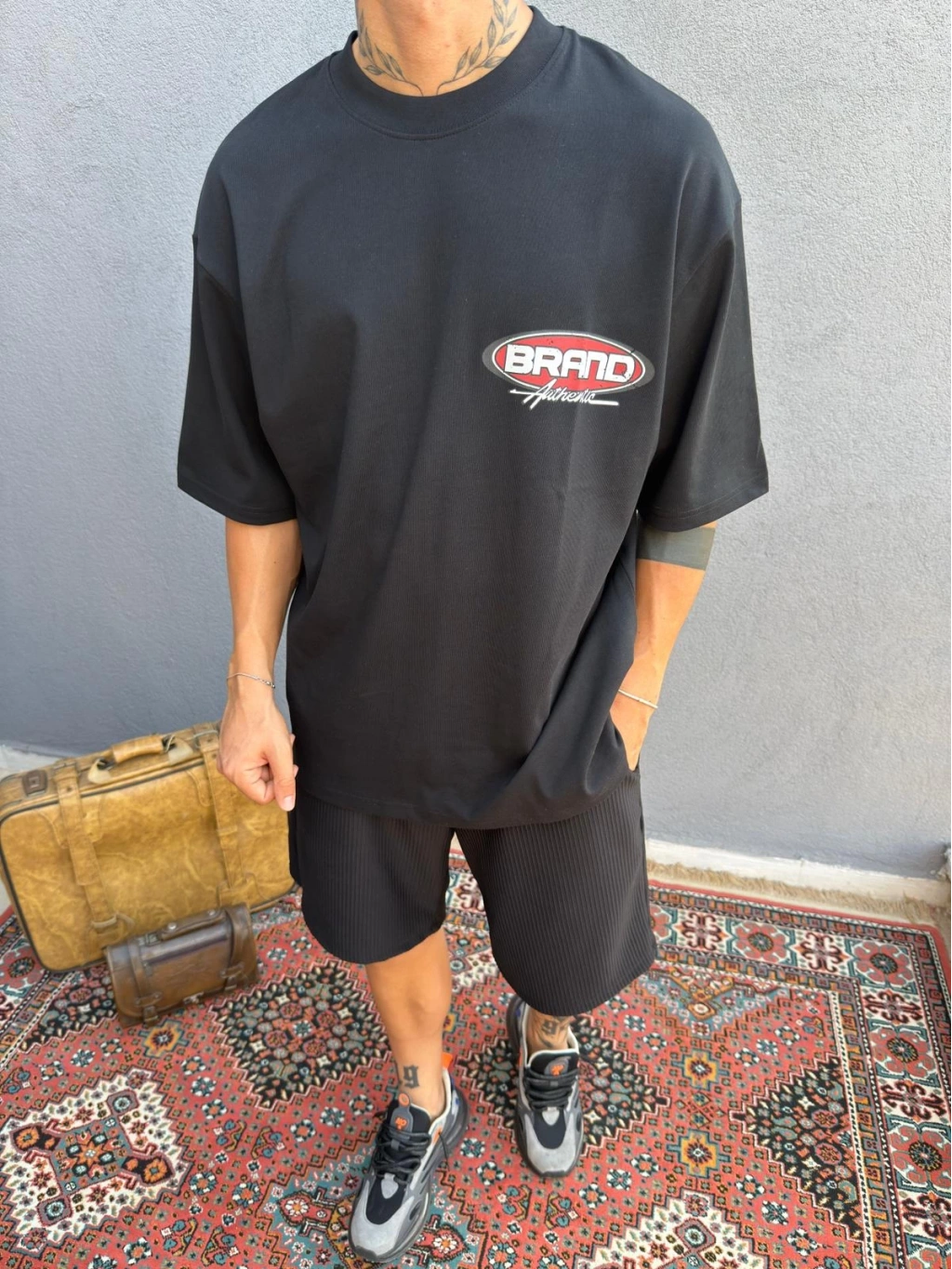 Siyah Düğmeli Waffle Kumaş Rahat Kesim T-Shirt